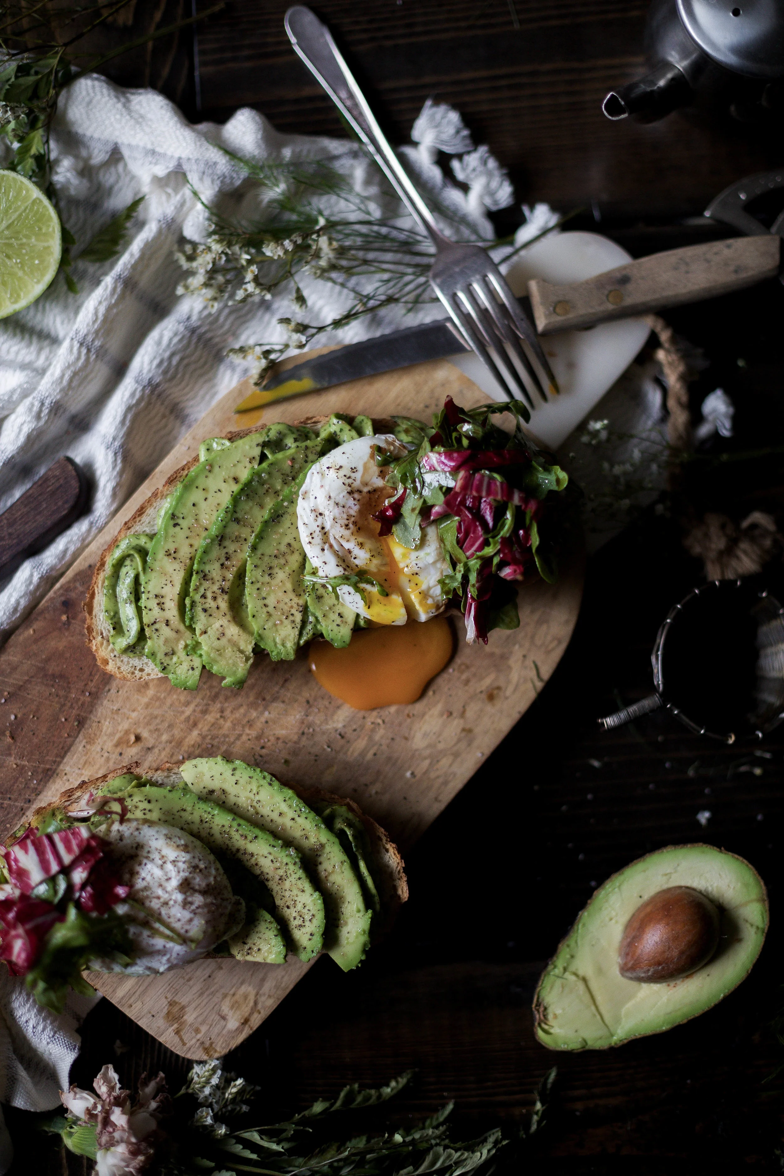 Avocado two ways on sourdough with poached eggs & balsamic radicchio