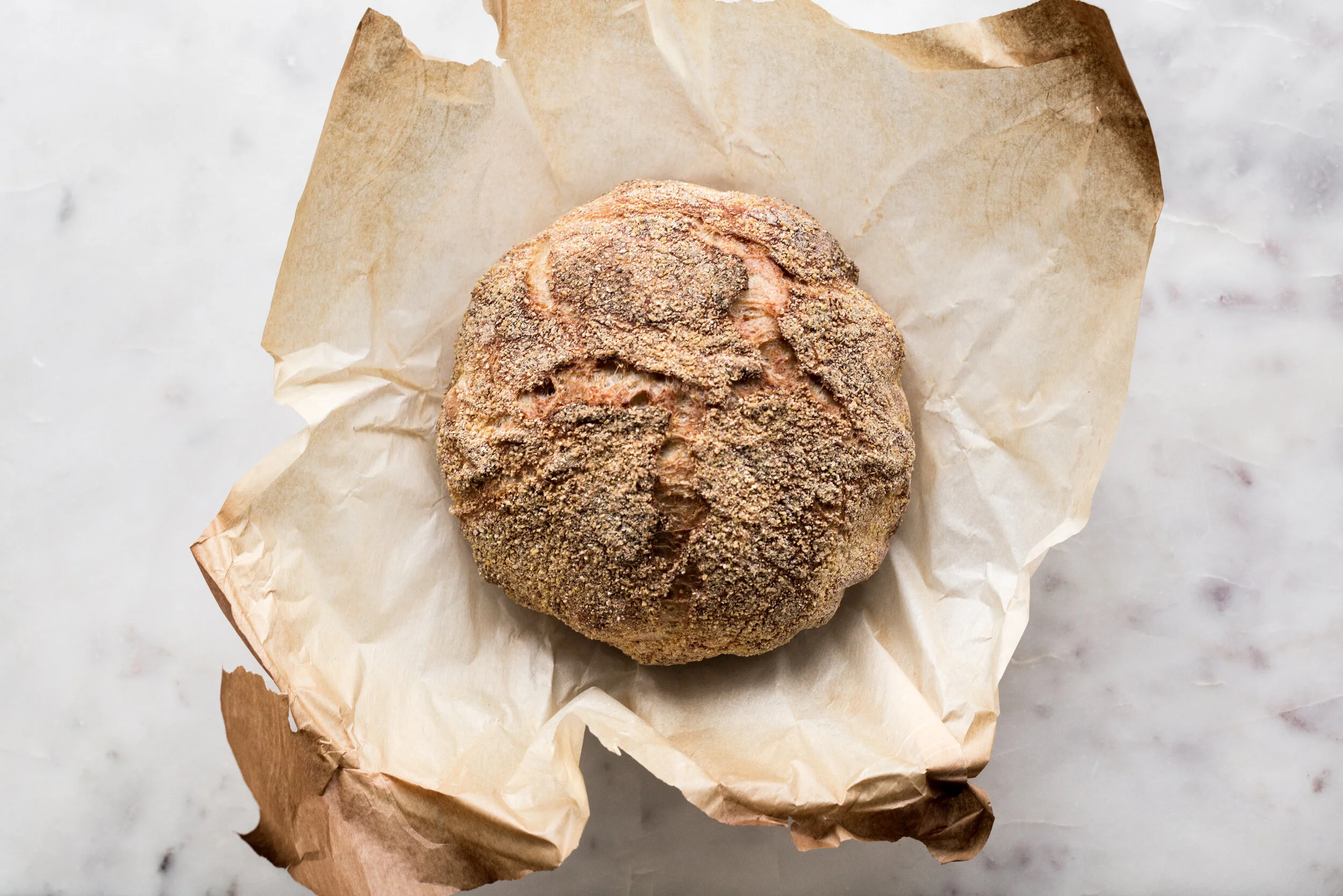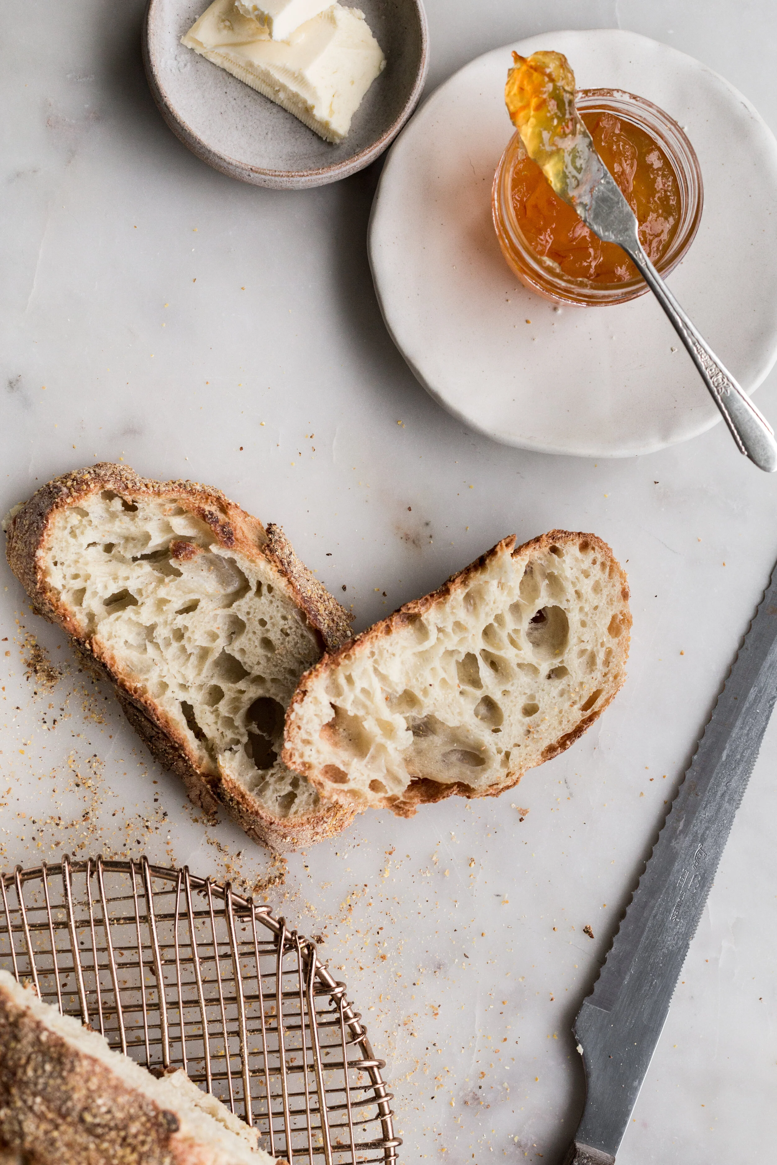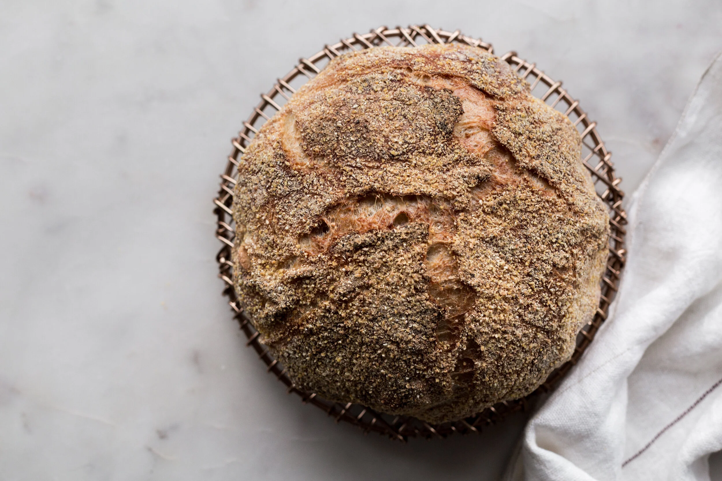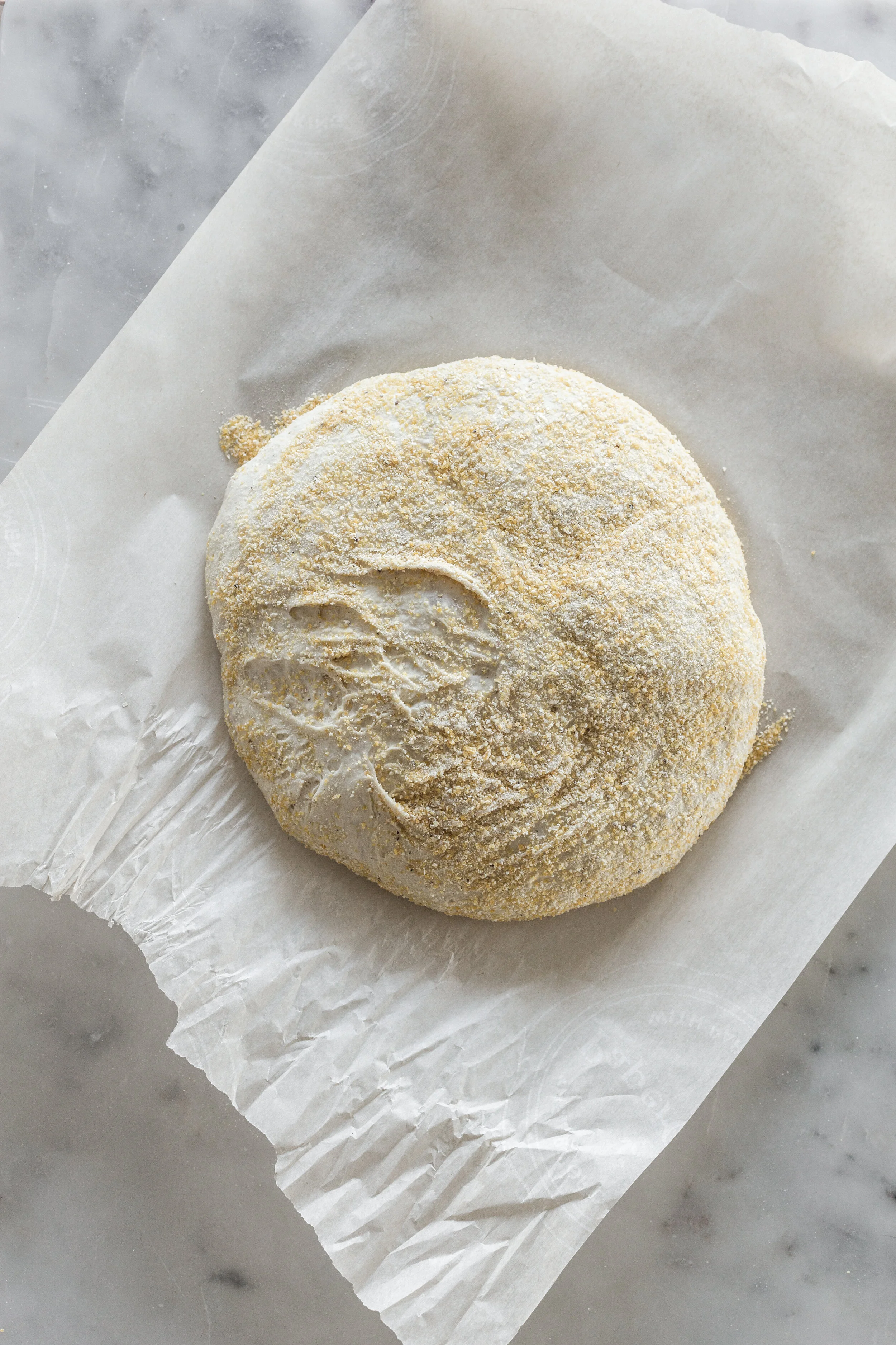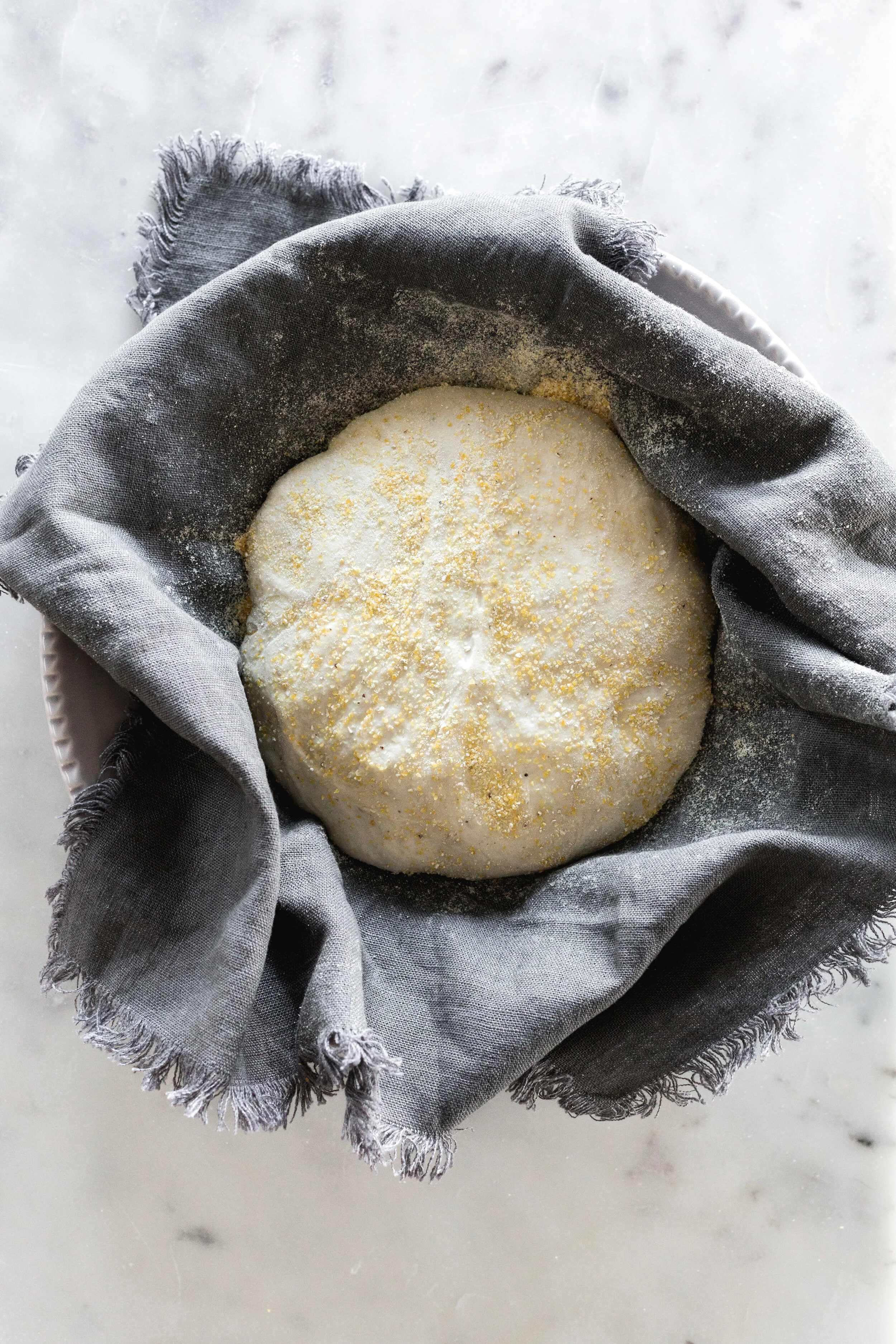 Layout a large linen or cotton cloth and generously dust it with cornmeal, flour or wheat bran. My favourite is cornmeal it gives the crust a beautiful texture and crunch! Gently lift the dough onto the dusted cloth, seam side down. Dust the top with some more cornmeal or whichever you are using. Wrap the sides of the cloth (loosely & lightly) around the dough and place into a clean wide-mouthed bowl. Let this rise in a warm spot for 1 1/2-2 hours or once doubled in size again. You can check by poking a finger into the middle, if it doesnโt hold the impression keep rising in 15 minute increments.