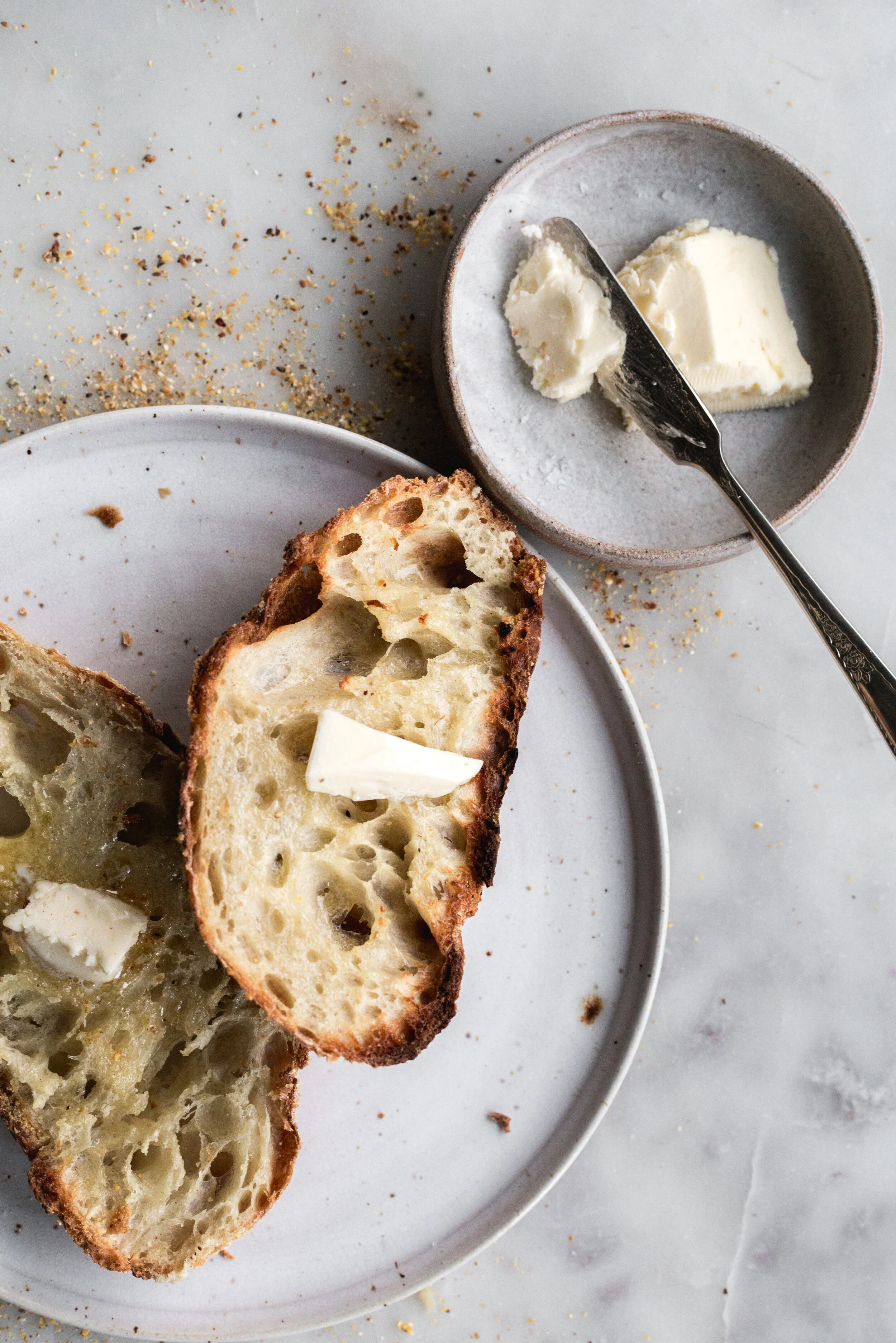 It quite literally takes 5 minutes to throw together, yes there is some waiting time 14-18 hours, butttt every step in-between waiting is literally 5 minutes or less of your time! The exterior has the best crunchy texture, the interior is soft and chewy and full of crevices for all of the butter, honey, jam or balsamic and vinegar to soak into (just a few of my favourite toppings for this here no-knead bread).