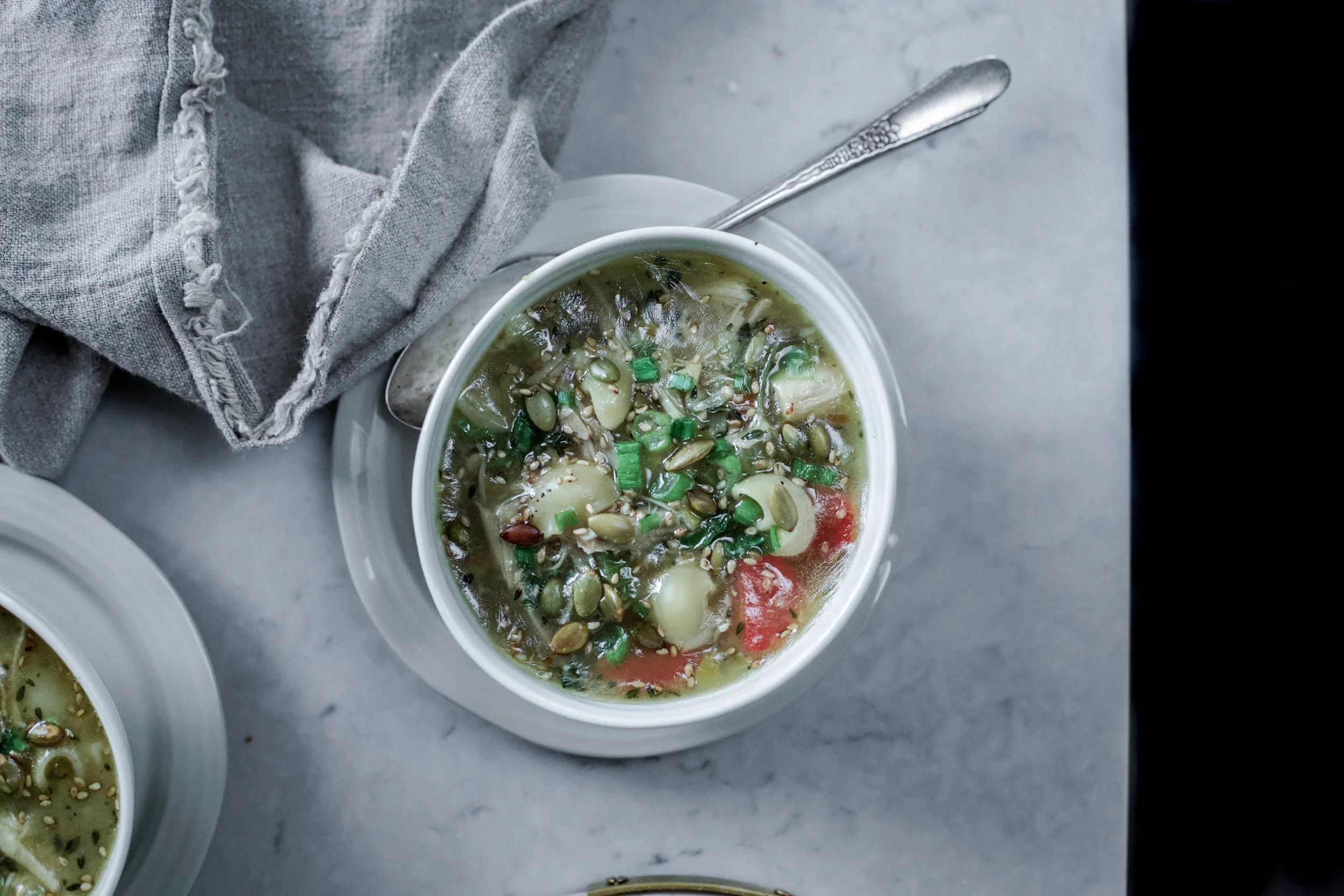 In a small pot, on medium heat, add a splash of olive oil and a tsp of butter, chop up some leeks and add to the pot, stirring until browned. De-glaze with a splash of white wine, then add 6 cups of the broth. Bring to a boil and add your pasta noodles, if you roasted a chicken or turkey you can add some of that meat now as well. Once the noodles are half cooked add in some chopped carrot and celery. When the soup is almost done add in the broccoli (and cauliflower if using), simmer for another minute and serve immediately. Garnish with green onion, sesame seeds and roasted pumpkin seeds!