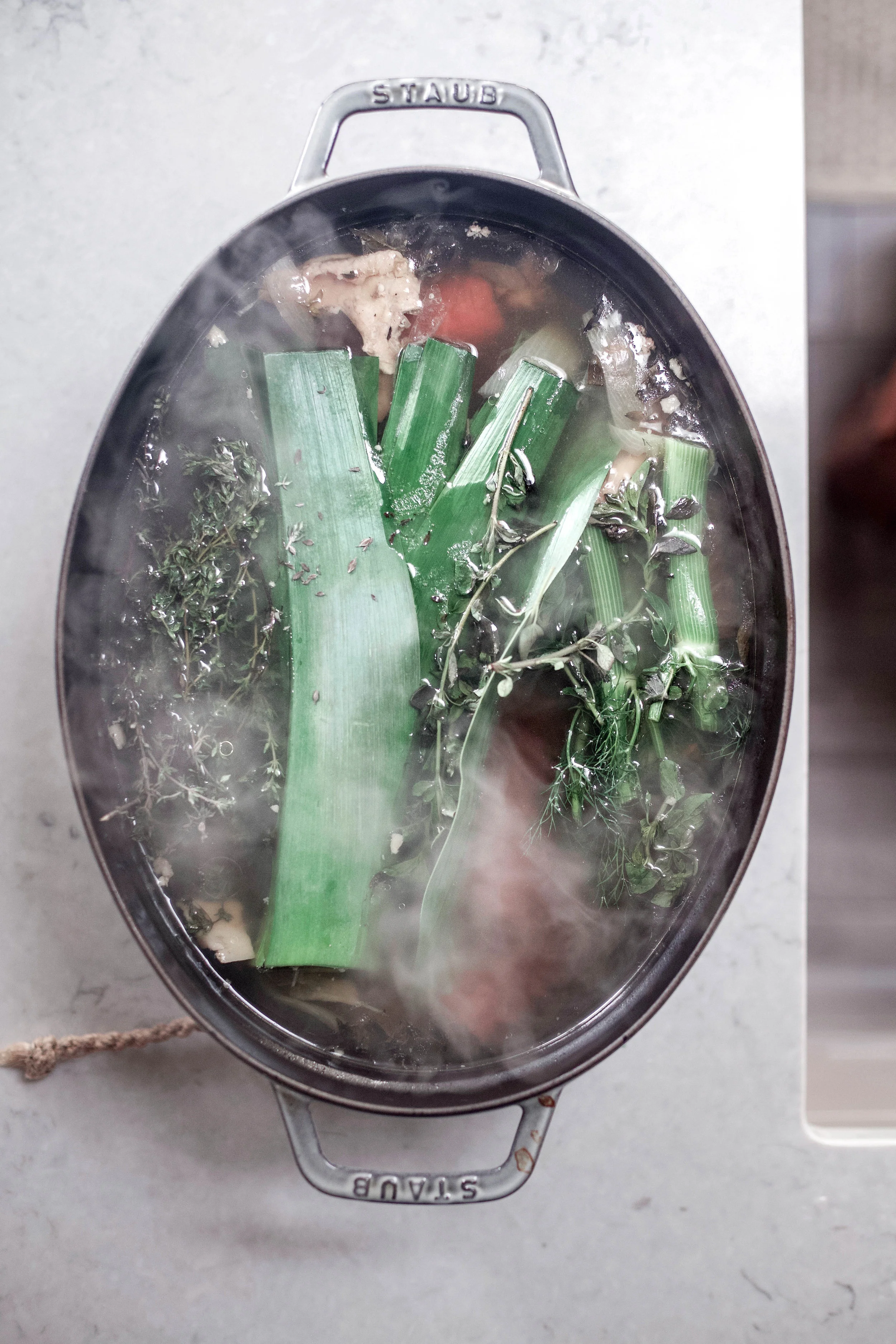If you are using the carcass of a roast chicken or turkey, take all of the meat off the bones and place them back into the pot/Dutch oven you used to make your roast (if you are using bones from the butcher, roast them in the oven until they are golden brown before putting them in the stock). Fill the dutch oven with water and add in the rest of the broth ingredients. I usually take the skin off of the onions and garlic, and cut the onion into quarters. Break the celery in half and cut the carrots into 3rdโs. It is all just simmering together! Bring the water to a boil and then immediately down to a low simmer, place the lid on and keep on simmer overnight or for best results 24 hours.