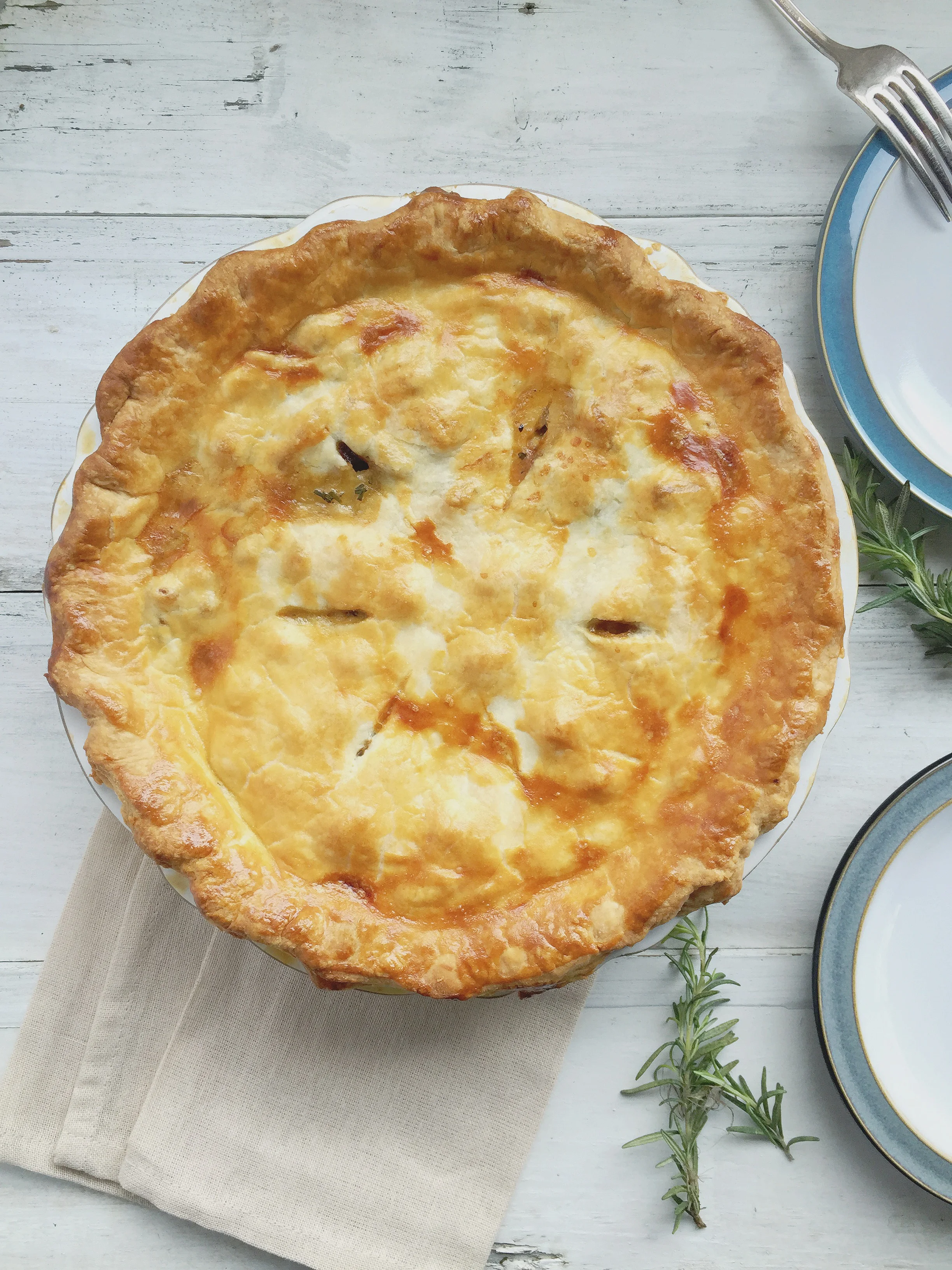 I used A couple Cooks pie pastry recipe and it turned out amazing, super flakey and light!! The only thing I added was an egg wash on the top of it to give it that extra golden hue.