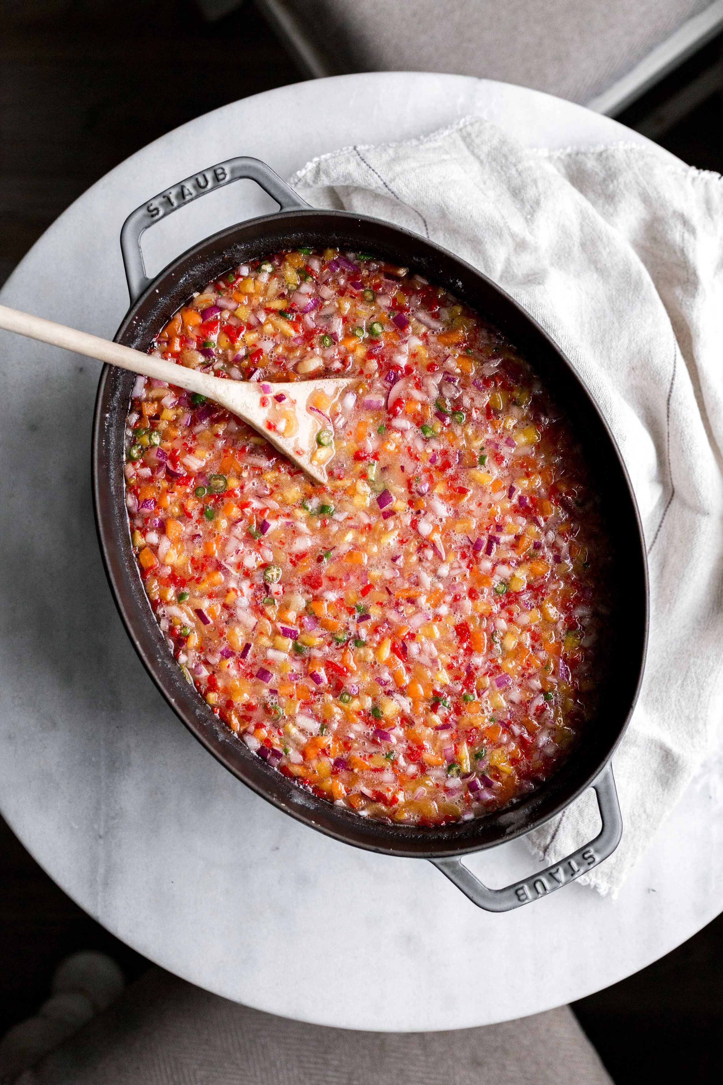 Once the apricots have soaked, add the peppers and onion to the pot, along with the sugar.