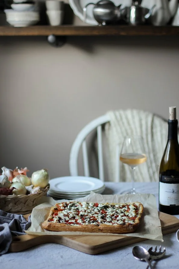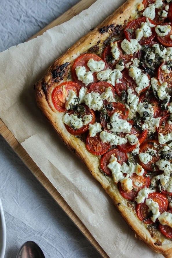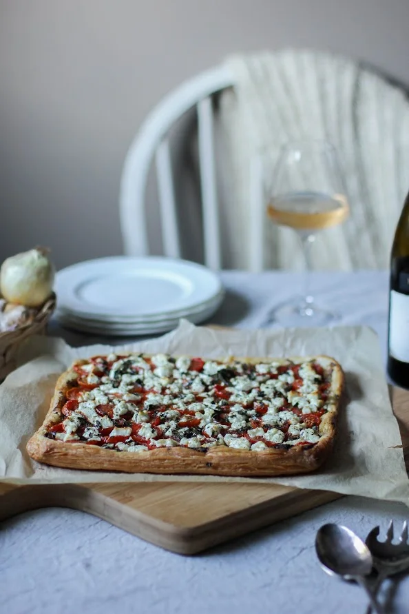 Tomato, thyme, white wine & goat cheese puffed tart