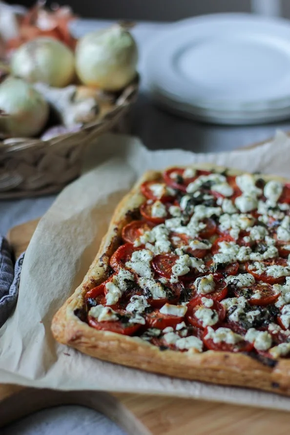 This tart is one of the most flavourful things I have in my back pocket. I have made it for different occasions over the years. Sometimes I make them into small individual sized puffed tarts, or like the one here one large puffed tart. You can also make a pastry dough and use a pie dish to make a larger tomato tart with them, I have done that before and used heirloom tomatoes and it is absolutely divine.